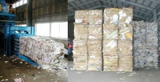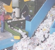 製紙工場に持ち込まれた古紙は、パルパー(ミキサーのようなもの:図上)に入れられ、水で溶かされドロドロに溶かされます。